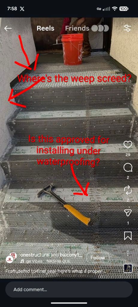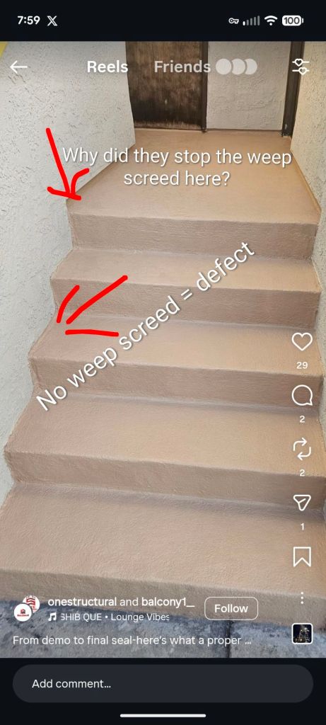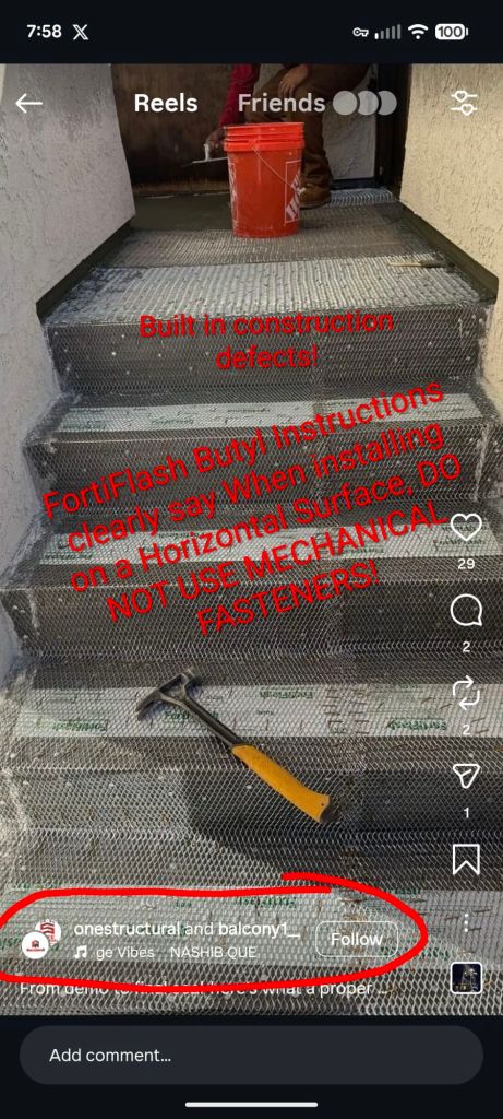 A recent Insta video posted by One Structural/Balcony 1 reminded me of the lyrics from a 1972 song by Stealers Wheel… And after watching the video several times I wondered why I wasn’t having a stroke over the numerous defects in their work. The video purports to show their expertise in rebuilding a set of stairs and waterproofing them. (The video appears to have been removed from their profile located here https://www.instagram.com/onestructural?igsh=MzRlODBiNWFlZA==)