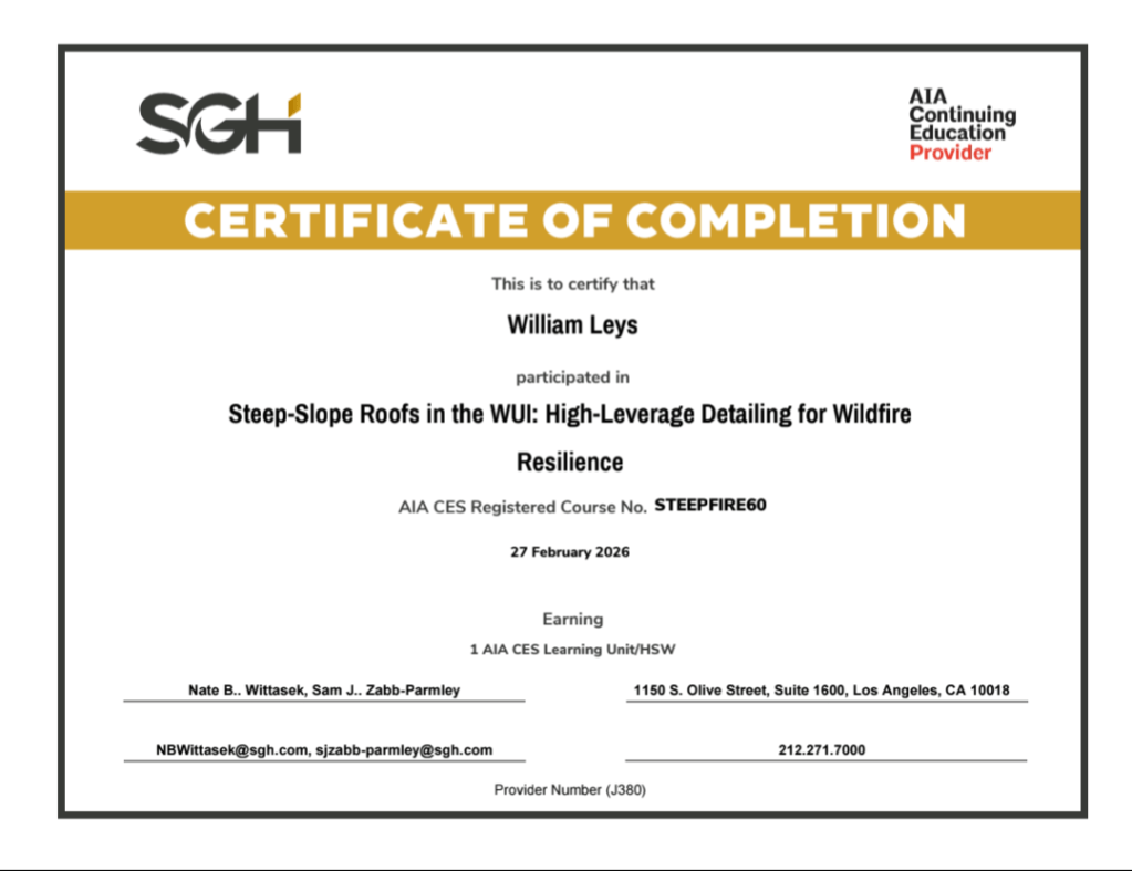 President Bill Leys of William Leys Waterproofing Consultants LLC recently attended a webinar presented by SGH on “Steep Slope Roofs in the WUI”.