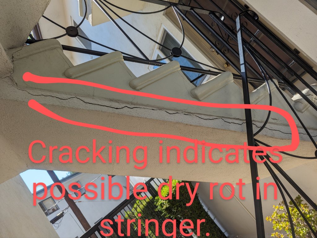 One stairway caught my eye with the long large crack in the Magnesite rubbing down the stair stringer. This critical piece of framing behind the Magnesite has, in my opinion, been infiltrated with water, has swollen and caused the Magnesite to crack and is likely dry-rotted as well, creating a life safety concern should it fail with people in the stairs.